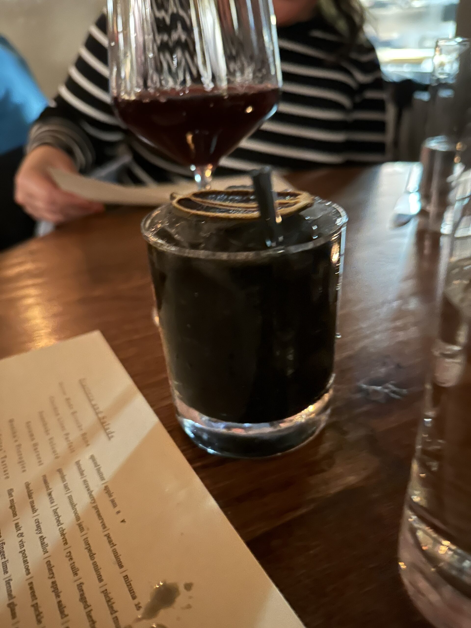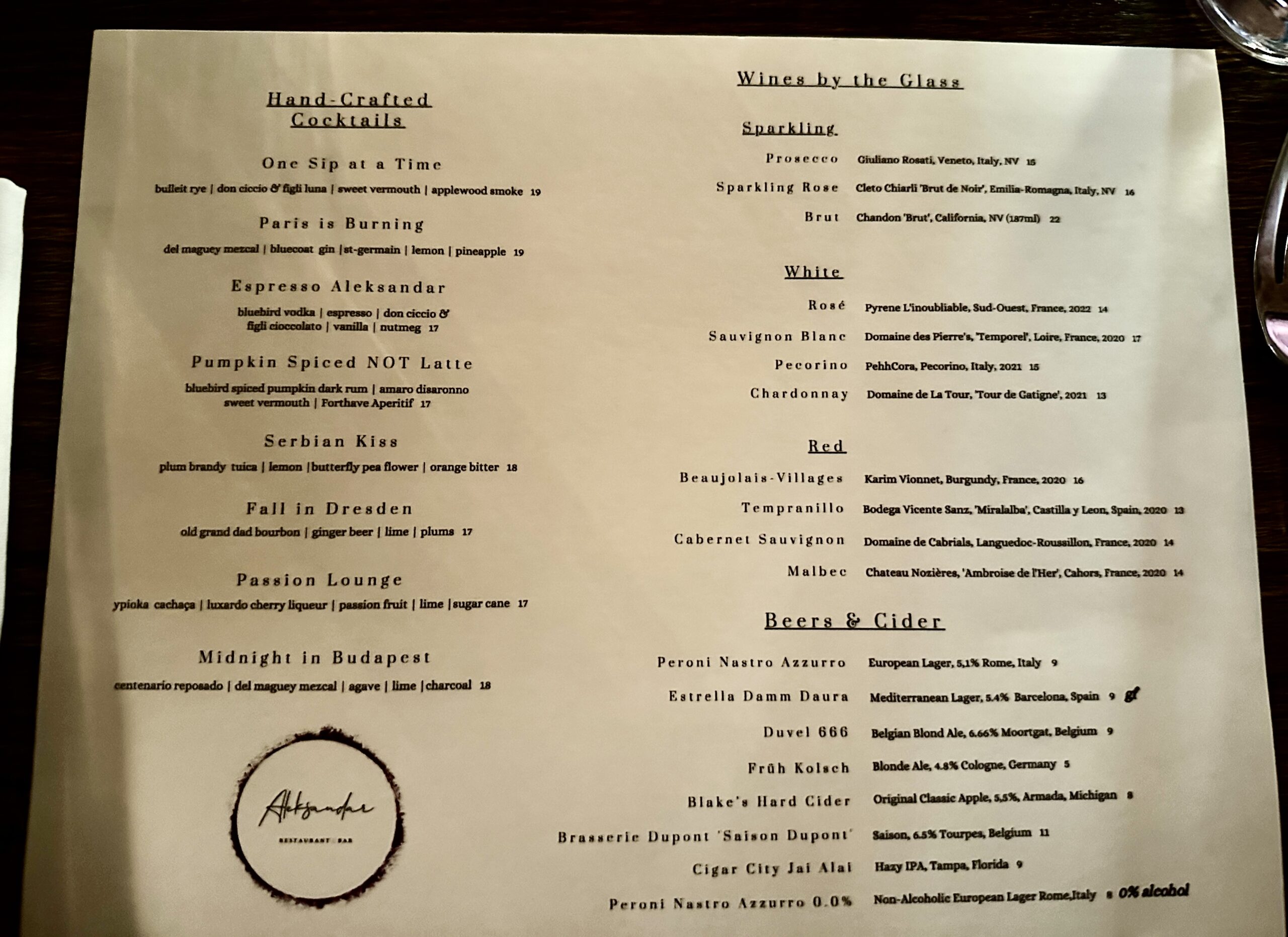 Upon arrival, the cocktail menu immediately catches the eye, promising creations that are as intriguing as they are flavorful. The “Paris Is Burning” is a cocktail that commands attention, a fiery dance of mezcal and gin, mellowed by the subtle sweetness of pineapple. It’s a drink that starts the evening with a spark. The “Fall In Dresden” is a libation that embodies the season, with notes of ginger and bourbon that mingle like autumn leaves in a warm breeze. For those who favor a darker, more soulful drink, “Midnight in Budapest” offers a deep, smoky profile, the agave and charcoal elements creating a night-time narrative in a glass. And the “Espresso Aleksandar,” with its velvety blend of vodka and espresso, provides a perfect balance between a cocktail and a dessert coffee, rich with the aroma of vanilla and nutmeg.