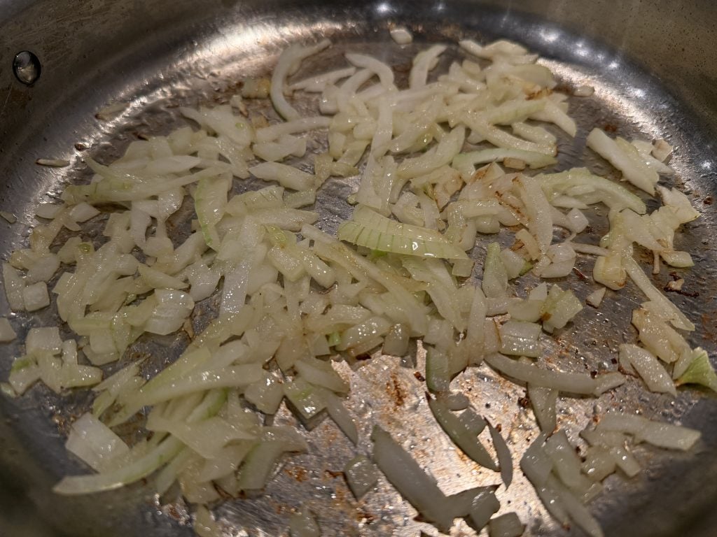 - Add the sliced onions and cook, stirring occasionally, until soft and starting to caramelize. About 8 to 10 minutes. Season lightly with salt.