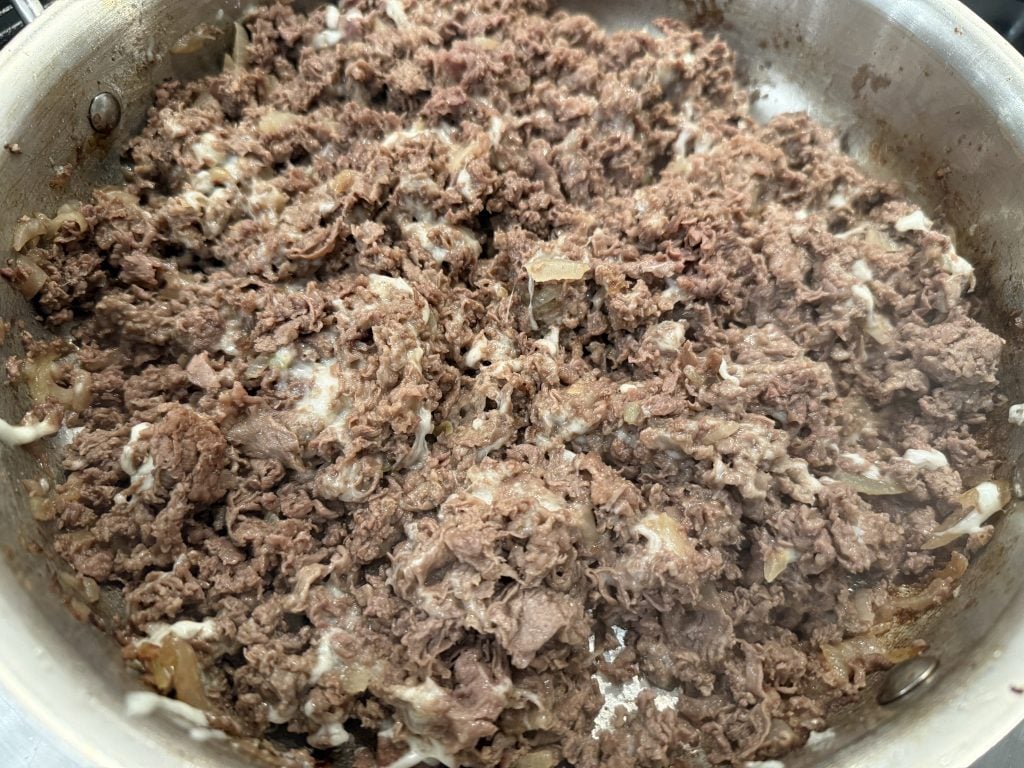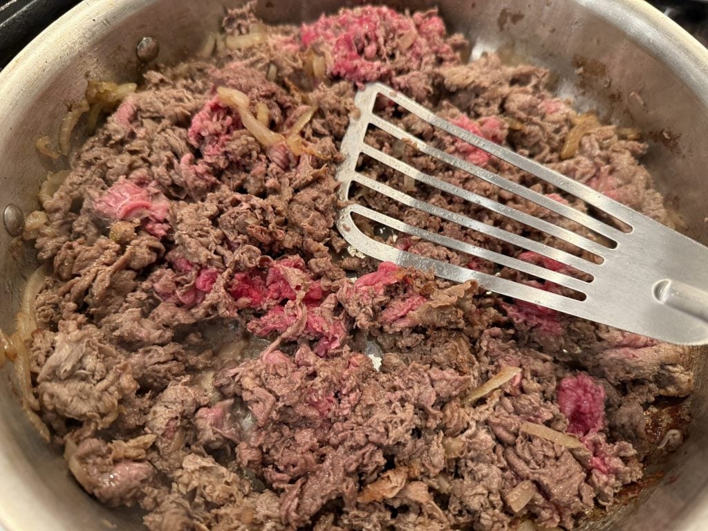 - Follow all the steps above through cooking the beef and onions.