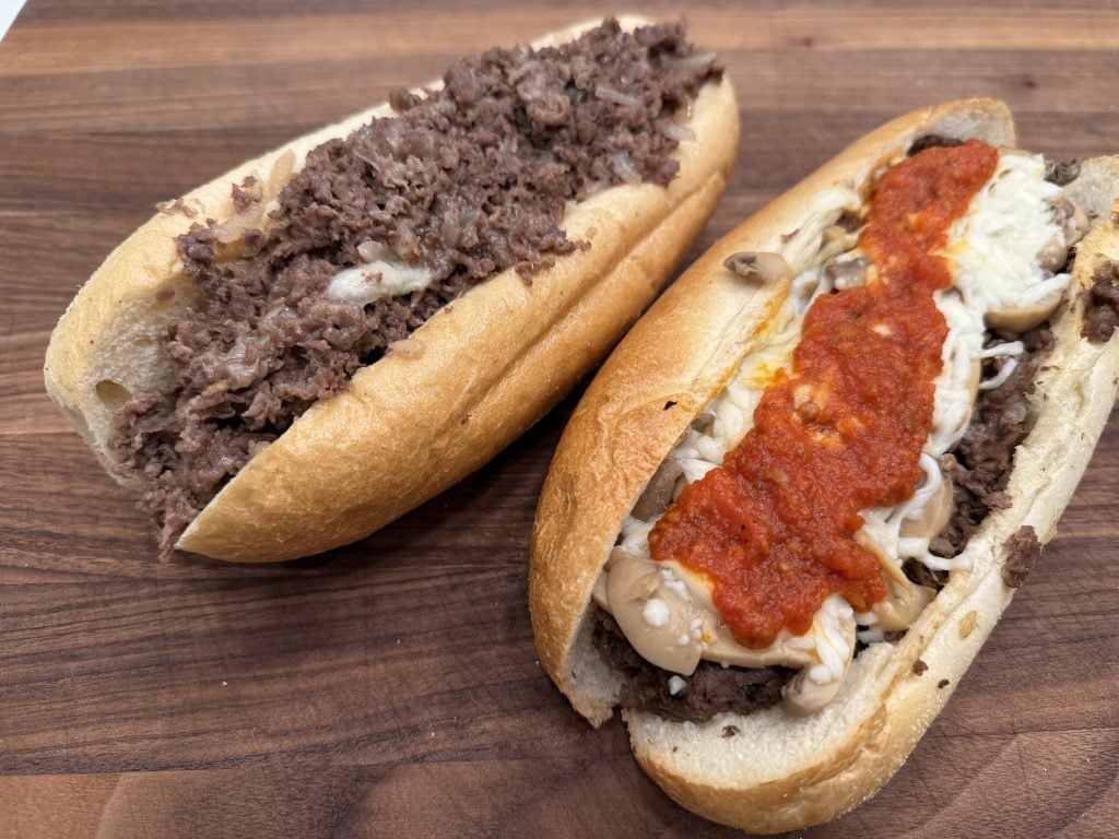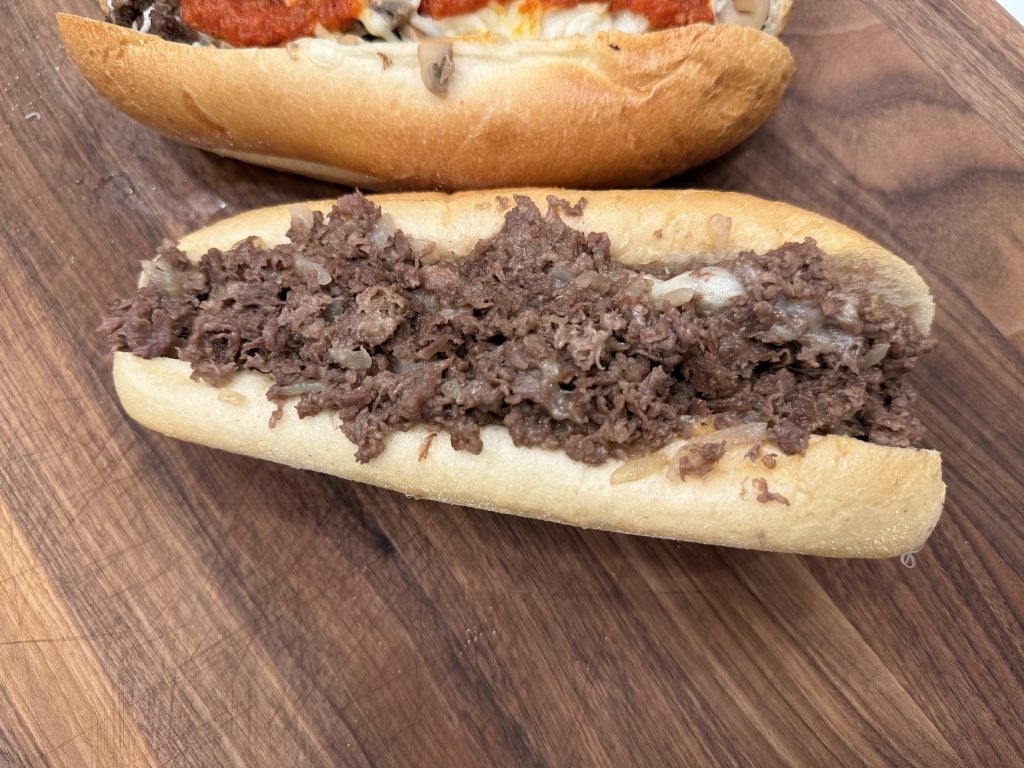 Don’t overthink it. A cheesesteak is a simple sandwich. Beef, cheese, onions if you want them, good roll. That’s it. Don’t add a bunch of stuff that doesn’t belong.
